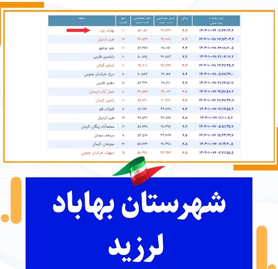 به گزارش پایگاه خبری ندای بهاباد زمین لرزه 3.3 دهم ریشتری سحرگاه امشب باردیگربهاباد را لرزاند وموجب ترس و هراس مردم شد.